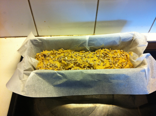 Rør alt sammen og ha i en liten brødform dekket med bakepapir.